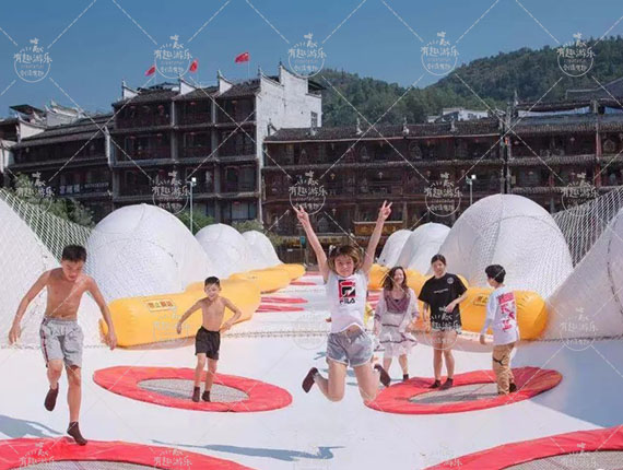 水上魔毯特征:水上魔毯項(xiàng)目建設(shè)在寬闊的水面上,采用充氣軟床、蹦床、繩網(wǎng)等柔性材料搭建一座有趣的軟橋。水上魔毯項(xiàng)目可以讓游客在橋面上彈跳、奔跑、翻滾等作出自由的動作。水上魔毯是景區(qū)、營地中新型的游樂項(xiàng)目